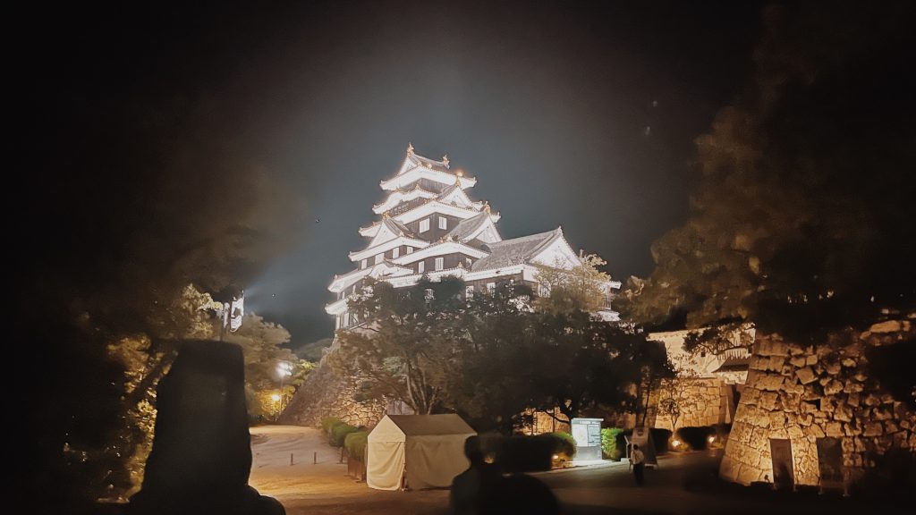 祭りはすでに片付けに入っていたのでその横を通り過ぎながら城の方へ向かう。道がとても暗い。ひとりがスマホの明かりで足元を照らしてくれた。後楽園と岡山城のあいだを流れる川でなにかがはねて、ジャポンという水の音がたびたびしていた。城のかなり近くまで住宅があって人が生活している気配があった。代々お城の関係者なのかな、そういえば城主は誰だろうとスマホに目を落としてインターネットで城主の情報を調べてみる。初代城主が宇喜多秀家!2代目城主は小早川秀秋だ!関ヶ原の戦いあたりの歴史に結構興味があるのでつい声が出てしまった。みんな、へー、と返してくれて、やさしくてうれしい。